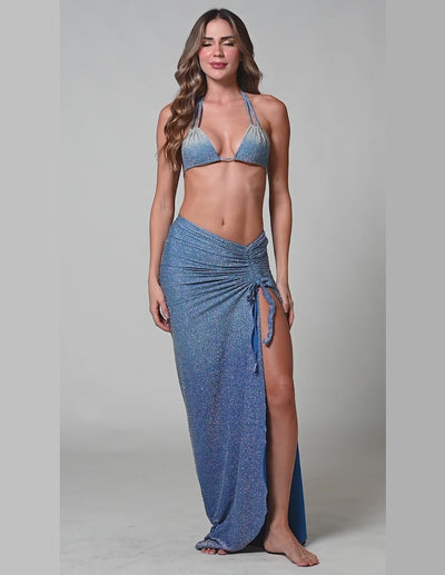 Este outfit combina un top que realza el busto con copas removibles y un brillo plateado que destaca la piel, junto a un panty tipo cortinita totalmente ajustable que estiliza la figura, y una falda versátil que puedes usar de múltiples maneras para lograr una silueta elegante y estilizada. Es un conjunto pensado para resaltar tu cuerpo y hacerte brillar en cualquier ocasión.
