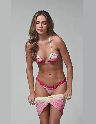 El top tejido en macramé crea un equilibrio perfecto entre estructura y sensualidad, ajustándose al cuello y la espalda para generar un efecto push up natural. El panty, con su pretina tejida, deja ver la piel de forma sutil y magnética, y puede llevarse más arriba en la cintura para alargar visualmente las piernas. El pareo en tul, liviano y de secado rápido, eleva el look con un efecto en V que estiliza la figura y aporta movimiento, convirtiendo este outfit en una pieza protagonista dentro de tu colección.