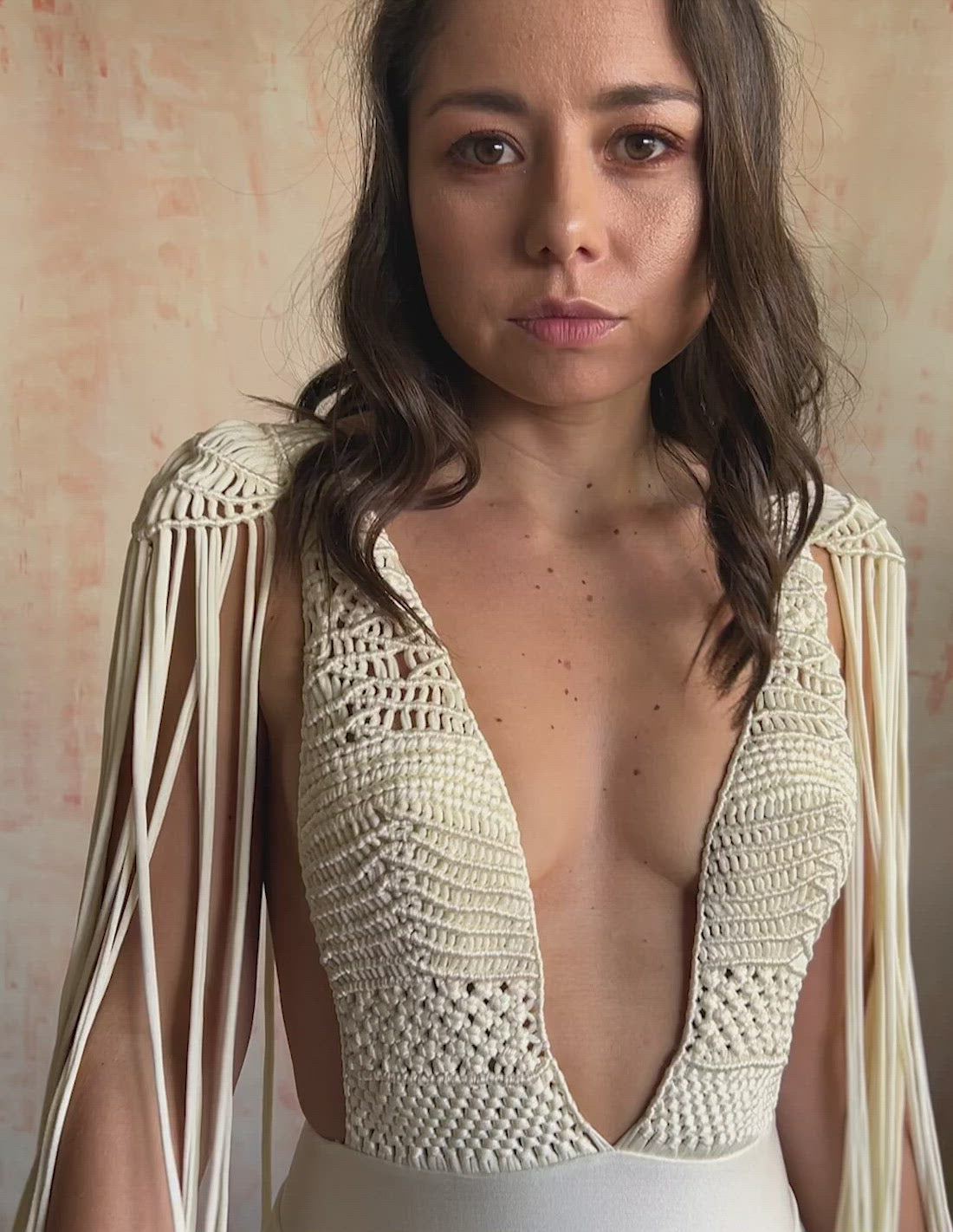 Accesorio 100% tejido a mano en la técnica macramé, usando como material cordón celular, decorado con cadenas de acero inoxidable y accesorio en forma de perla. Pieza versátil y ajustable que puede ser usada como choker y liguero