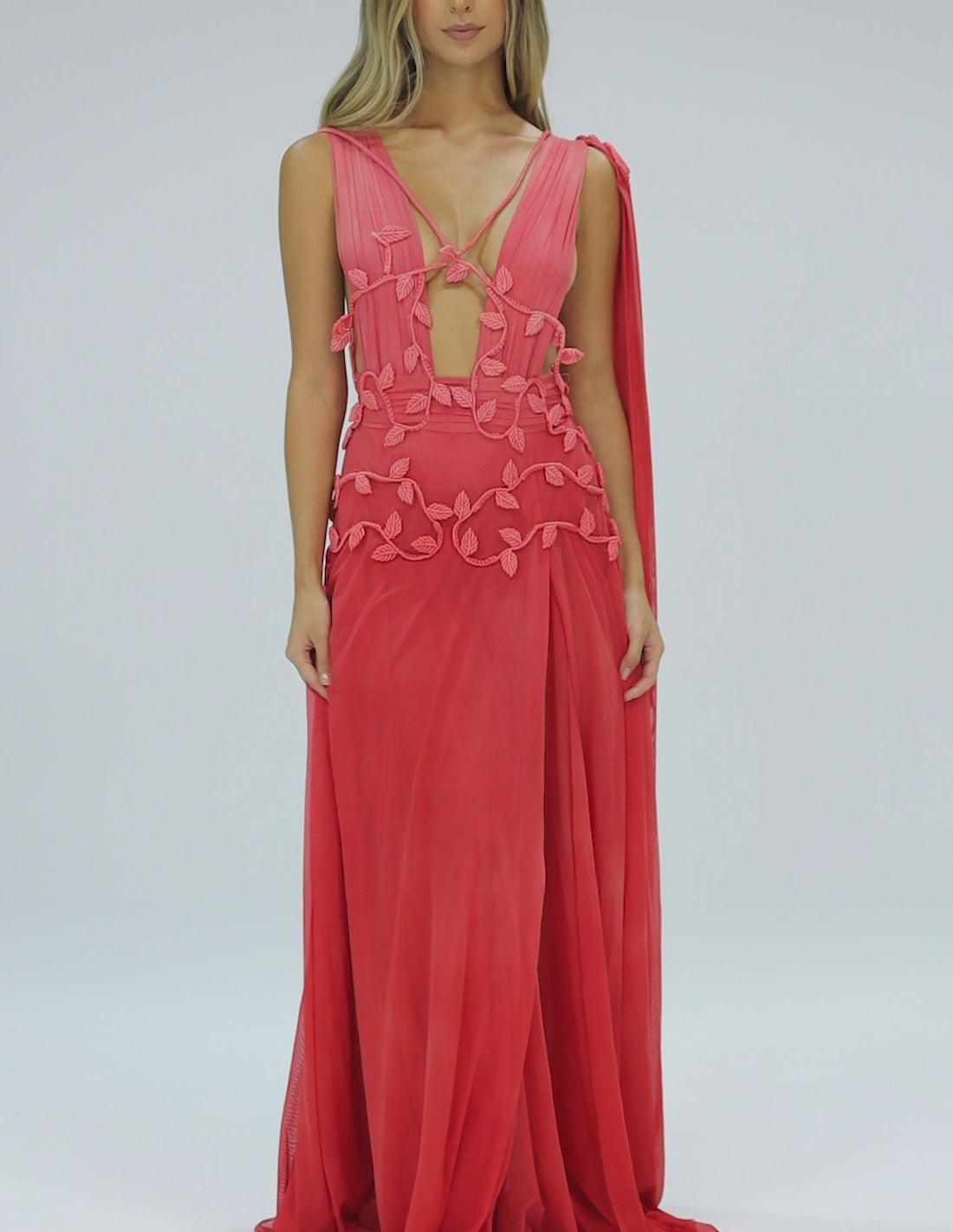 ¡Nuestro Copernico es una obra de arte verdaderamente única! Este vestido sensual e impactante con un escote en V pronunciado, la espalda escotada, tiras de tul anchas para amarrarlo como más te guste, una abertura alta en la pierna y hermosas hojas elaboradas en macramé.