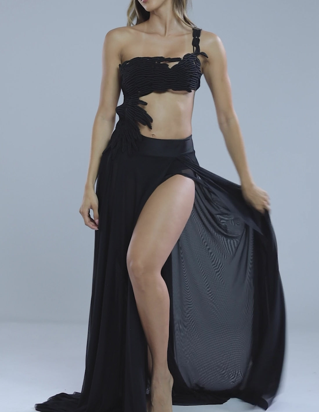 El vestido Cisne envuelve el abdomen y abraza tu cuerpo para un look cómodo y sexy. Su top es tejido en macramé con un fajón ancho, y aberturas altas a los lados de la falda. Es ajustable en la espalda y la falda tiene dos capas de tul.
