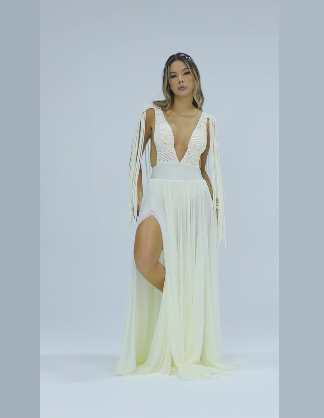 Vestido Atenas, una prenda especial con un escote profundo que te hará ver más estilizada y busto tejido en macramé… un tirerio en los hombres completamente WOW y en posterior, una falda en tull que te dará un movimiento espectacular.